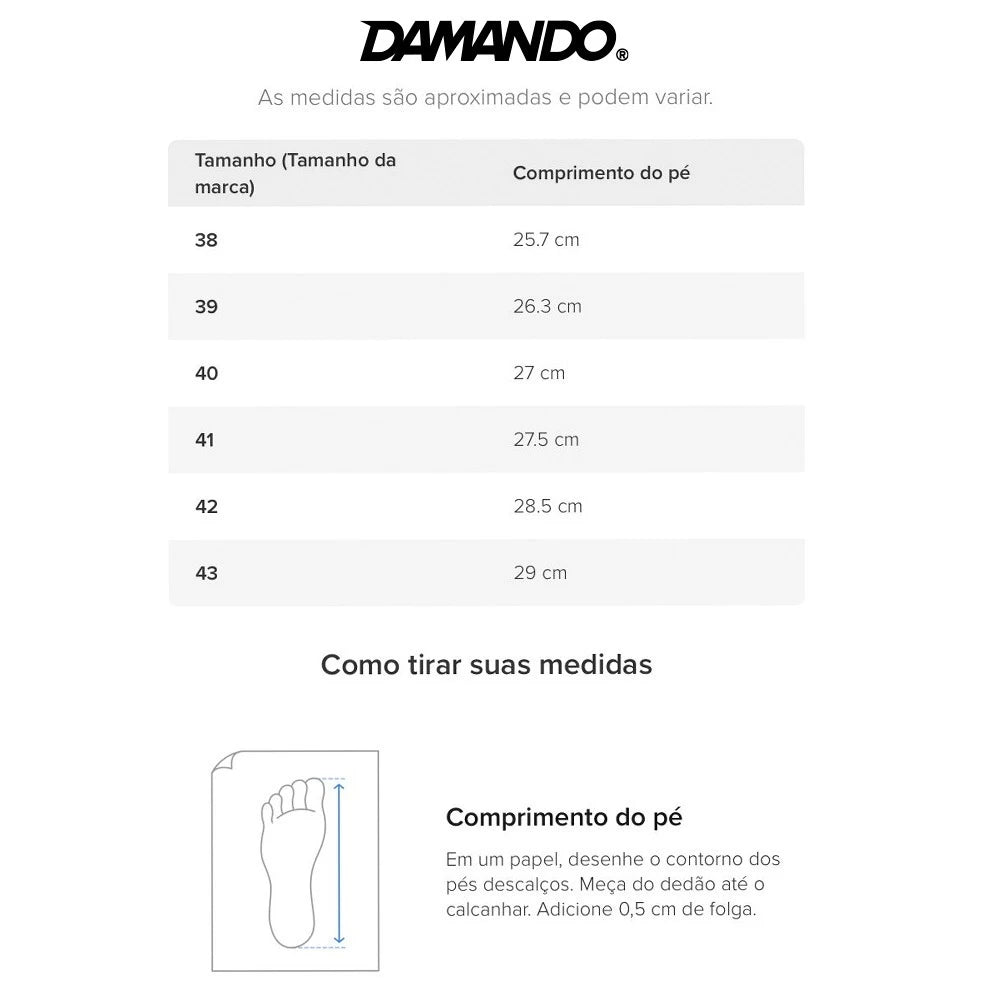👉 Dica: Compare as medidas com um calçado que você já usa para garantir a escolha perfeita!