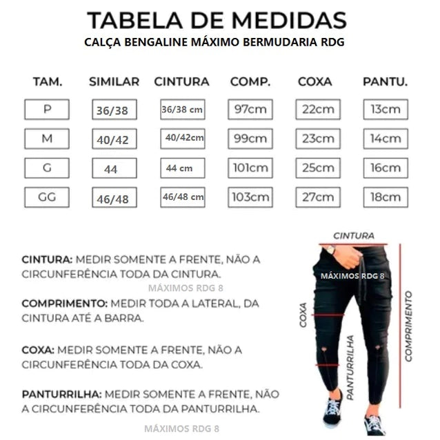 GG (46/48): 46/48 cm largura x 103 cm comprimento x 27 cm coxa x 18 cm panturrilha